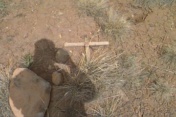 Unknown Sandstone rock and wood cross laying down