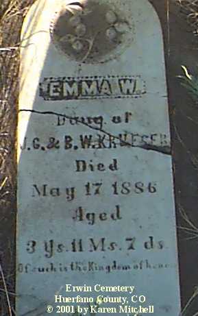Krueger, Emma W. born --- died 5-17-1886 3y 11m 7d, Daughter of J.G. and B.W. Krueger