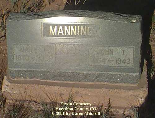 Manning, John T. born 1864 died 1943, County Burial Permit: John Thomas Manning, died at La Veta 2-12-1943, age 78y 9m 19d.