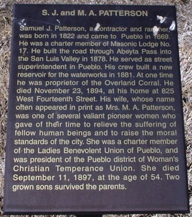 Samuel J. Patterson, a contractor and rancher, was born in 1822 and came to Pueblo in 1869. He was a charter member of Masonic Lodge No. 17. He built the road through Abeyta Pass into the San Luis Valley in 1878. He served as street superintendent in Pueblo. His crew built a new reservoir for the waterworks in 1881. At one time he was proprietor of the Overland Corral. He died November 23, 1894, at his home at 825 West Fourteenth Street. His wife, whose name often appeared in print as Mrs. M.A. Patterson, was one of several valiant pioneeer women who gave of their time to relieve the suffering of fellow human beings and to raise the moral standard of the city. She was a charter member of the Ladies Benevolent Union of Pueblo, and was president of the Pueblo district of Woman's Christian Temperance Union. She died September 11, 1897 at the age of 54. Two grown sons survived the parents.