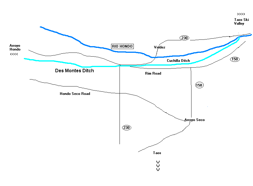 "The area of Des Montes is/was primarily determined by the the acequia which irrigates it, the Cuchilla Ditch (aka the Des Montes Ditch). This ditch comes out of the Hondo River. The water was diverted at the point where the river comes out of the mountain cut which now leads to the ski valley. It runs roughly west along the hillside, seemingly uphill, coming out near to what is now the intersection of Rt. 230 and the Rim Rd, aka Cuchilla Rd. From there it runs west over the flat mesa approximately 2m. between the Rim Rd (north boundary) and the Hondo-Seco Rd, aka the Middle Rd (south boundary). Des Montes ends on the west where this mesa drops rather sharply into Arroyo Hondo. The eastern boundary would be Rt. 230, if the Des Montes ditch were the only determining factor. Nowadays people refer to the mesa east of Rt.230 which is watered by the Revalse Ditch as Des Montes as well and perhaps this was the designation from the beginning." (Linda Moscarella, resident)